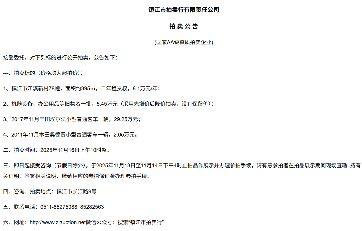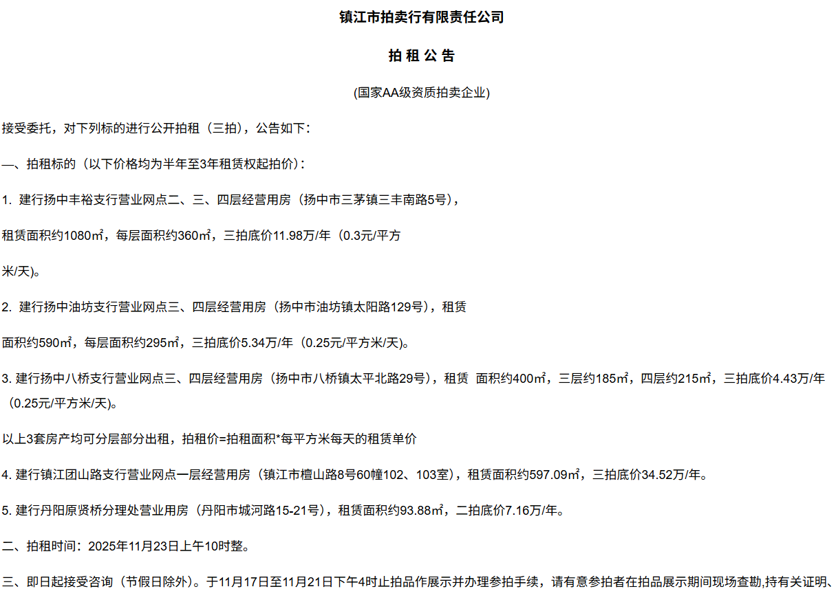 鎮江市拍賣行有限責任公司拍 租 公 吿(國家AA級資質拍賣企業)接受委托,對下列標的進行公開拍租(三拍),公告如下:—、拍租標的(以下價格均為半年至3年租賃權起拍價):1.  建行揚中豐裕支行營業網點二、三、四層經營用房(揚中市三茅鎮三豐南路5號),租賃面積約1080㎡,每層面積約360㎡,三拍底價11.98萬/年(0.3元/平方米/天)。2.  建行揚中油坊支行營業網點三、四層經營用房(揚中市油坊鎮太陽路129號),租賃面積約590㎡,每層面積約295㎡,三拍底價5.34萬/年(0.25元/平方米/天)。3. 建行揚中八橋支行營業網點三、四層經營用房(揚中市八橋鎮太平北路29號),租賃  面積約400㎡,三層約185㎡,四層約215㎡,三拍底價4.43萬/年(0.25元/平方米/天)。以上3套房產均可分層部分出租,拍租價=拍租面積*每平方米每天的租賃單價4. 建行鎮江團山路支行營業網點一層經營用房(鎮江市檀山路8號60幢102、103室),租賃面積約597.09㎡,三拍底價34.52萬/年。5. 建行丹陽原賢橋分理處營業用房(丹陽市城河路15-21號),租賃面積約93.88㎡,二拍底價7.16萬/年。二、拍租時間:2025年11月23日上午10時整。三、即日起接受咨詢(節假日除外)。于11月17日至11月21日下午4時止拍品作展示并辦理參拍手續,請有意參拍者在拍品展示期間現場查勘,持有關證明、簽署相關說明、繳納相應的參拍保證金辦理參拍手續。四、咨詢、拍租地點:鎮江市長江路9號五、聯系方式:0511-85275988   13655299933楊先生六、網址:http://www_zjauction_net.lfschg.cn;微信公眾號:搜索“鎮江市拍賣行” 拍品清單2025.11.23序號名稱起拍價(元)標的說明1建行揚中豐裕支行營業網點二、三、四層經營用房(揚中市三茅鎮三豐南路5號),租賃面積約1080㎡,每層面積約360㎡三拍底價11.98萬/年(0.3元/平方米/天)1、1-3號房產均可分層部分出租,拍租價=拍租面積*每平方米每天的租賃單價;2、意向競拍人在拍賣前需持營業執照或身份證與委托方說明租賃房產經營業態,確定意向后出具房產承租用途承諾書,經委托方審核后,方可交納保證金參加競拍;3、租賃期限為半年至3年(承租方與出租方協商而定),承租方每半年或一年結付租金,租賃期間的水、電費用及其它相關費用均由承租方承擔;4、承租方不得用于經營和保管危險物品,不得用于開設餐飲、娛樂等可能嚴重影響消防安全、運營安全的經營業態,不得用于經營委托貸款、小額貸款等可能冒用委托方名義,帶來聲譽風險的經營業態。租賃期內,承租方不得破壞墻體結構,自行成就消防、安全等使用條件,不得擅自將租賃房屋轉租、轉讓給他人使用,否則委托方有權收回房屋;5、拍租成交后,承租方將租金交至出租方指定賬戶,傭金交至拍賣方賬戶(拍租傭金為該房屋一個月租金)。承租方憑租賃合同無息退還保證金。2建行揚中油坊支行營業網點三、四層經營用房(揚中市油坊鎮太陽路129號),租賃面積約590㎡,每層面積約295㎡三拍底價5.34萬/年(0.25元/平方米/天)3建行揚中八橋支行營業網點三、四層經營用房(揚中市八橋鎮太平北路29號),租賃面積約490㎡,每層面積約245㎡三拍底價4.43萬/年(0.25元/平方米/天)4建行鎮江團山路支行營業網點一層經營用房(鎮江市檀山路8號60幢102、103室),建筑面積約597.09㎡三拍底價34.52萬/年5建行丹陽原賢橋分理處營業用房(丹陽市城河路15-21號),建筑面積約93.88㎡二拍底價7.16萬/年